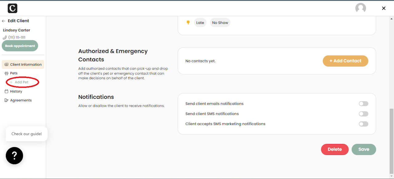 After saving your new client, you’ll see the left side of your screen automatically update to include a green +Add Pet link. This option allows you to seamlessly enter details for each pet within the family.
