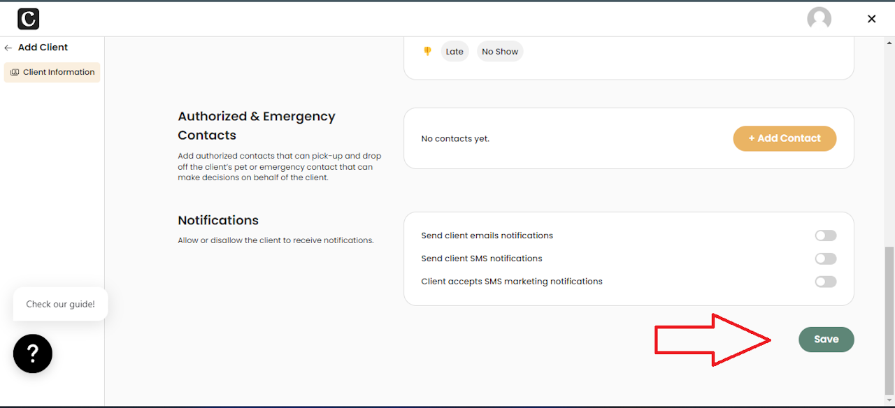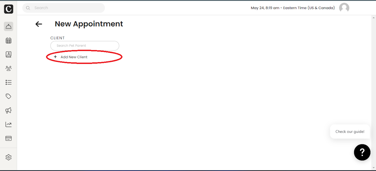 To add a new client, you have two options: through the Bookings page or the Clients page.