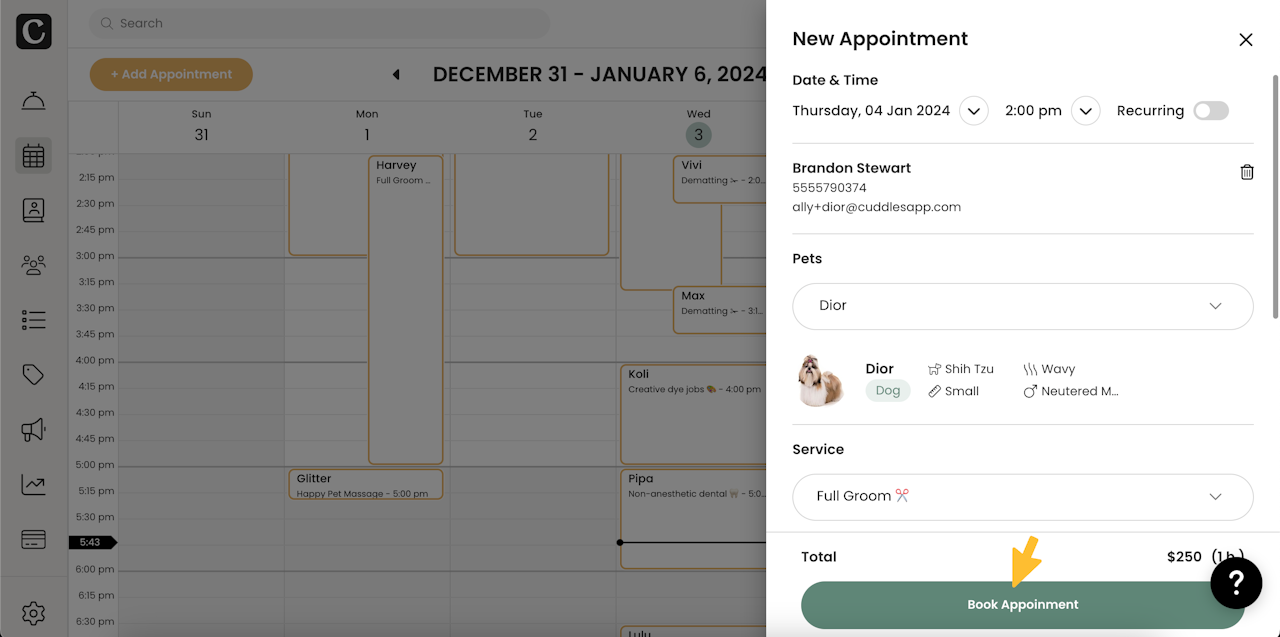 To book a new appointment, click on the Add Appointment button. Search for the client or pet, select the pet, choose the service, filter by staff if you want to, and select a day and time.