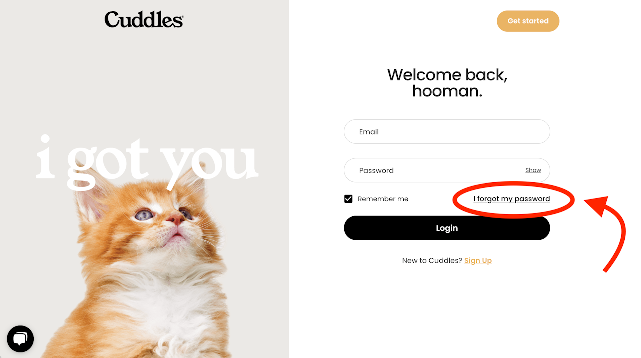 To Reset your password, on the Cuddles Login page, locate the I forgot my password link under the password box.
