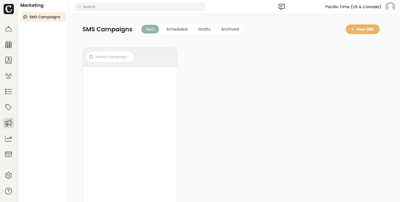 On the Marketing page, you'll find SMS Campaigns with options to view Sent, Scheduled, Drafts, and Archived campaigns.