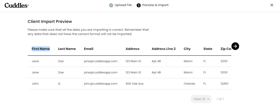 To help you get up and running quickly, Cuddles provides a simple client import template you can use to upload your full client list in just a few steps.